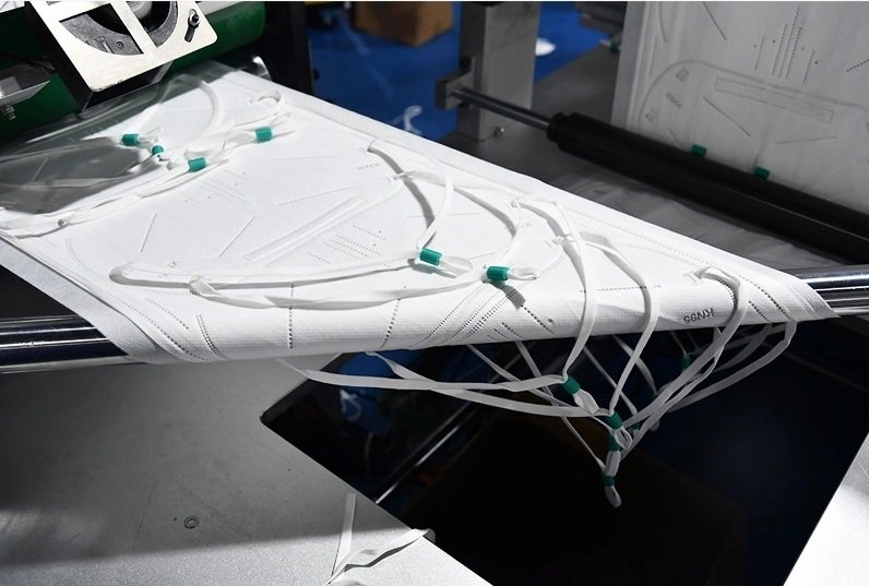 This machine is a fully automatic production of lengthened headband folding mask machine, and online buckle, modular design, 60-70 pieces per minute when the buckle function is off, 30-35 pieces per minute when the online buckle function is turned on, saving labor cost.